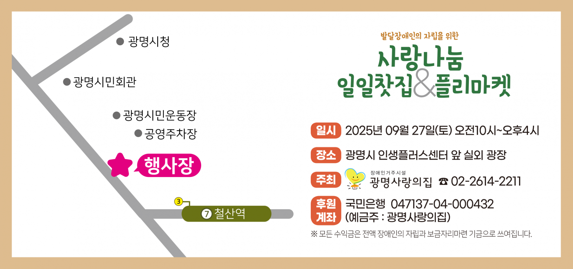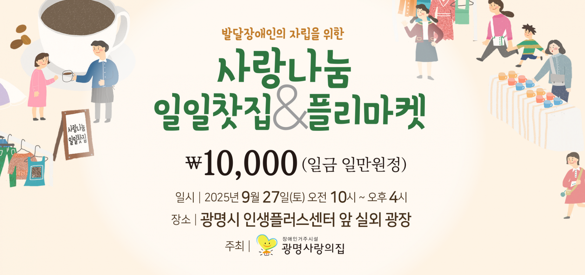광명시 장애인거주시설인 광명사랑의집은 오는 9월 27일(토) 오전 10시부터 오후 4시까지, 7호선 철산역 광명시 인생플러스센터 앞 야외 광장에서 발달장애인의 자립기금 마련을 위한 ‘2025년 사랑나눔 일일찻집 & 플리마켓’을 개최한다.